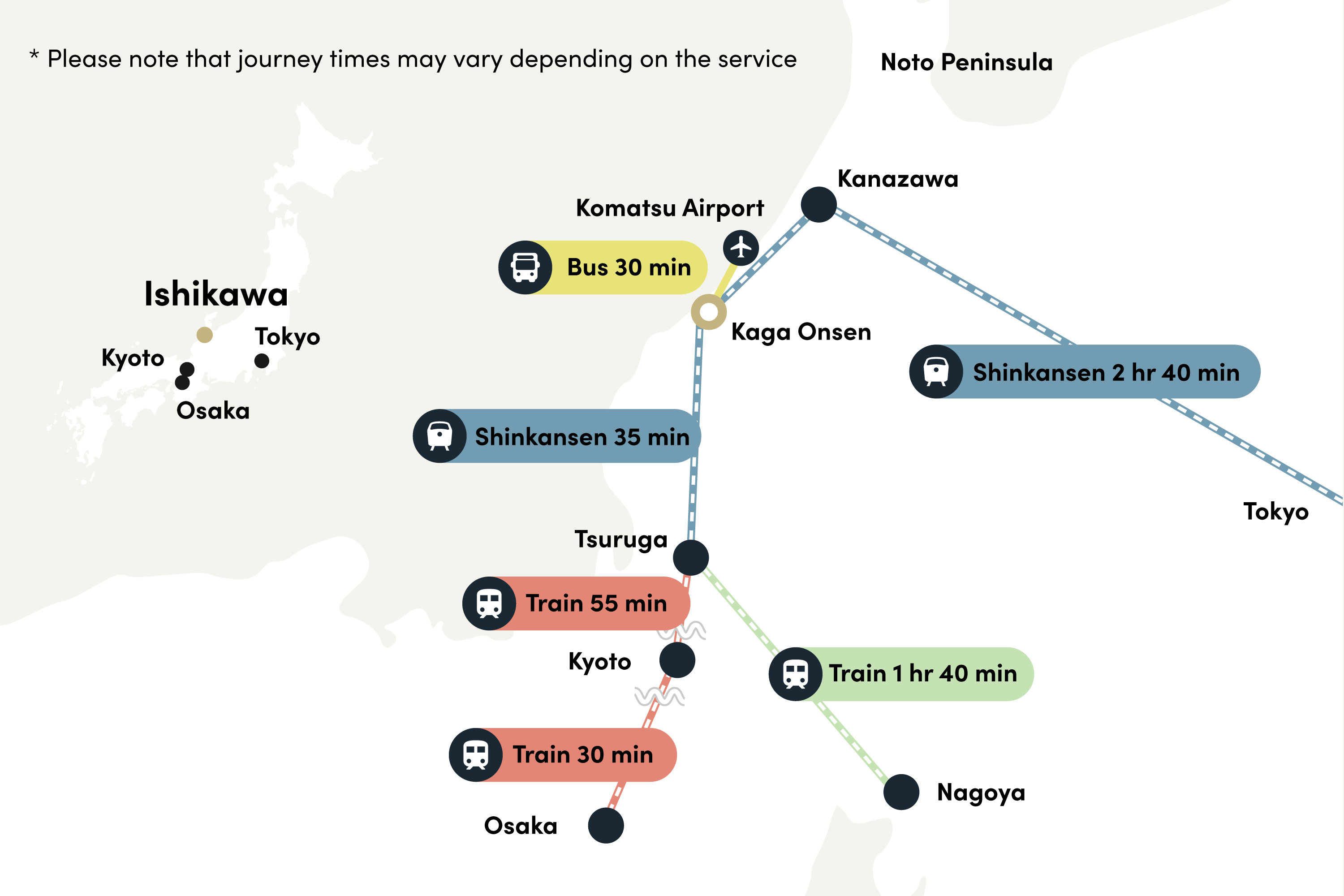 The Hokuriku Shinkansen provides a direct link between Tokyo and Kaga Onsen. JR limited express trains operate from Osaka, Kyoto, and Nagoya, stopping at Tsuruga Station in Fukui Prefecture for onward shinkansen connections to Kaga Onsen Station.