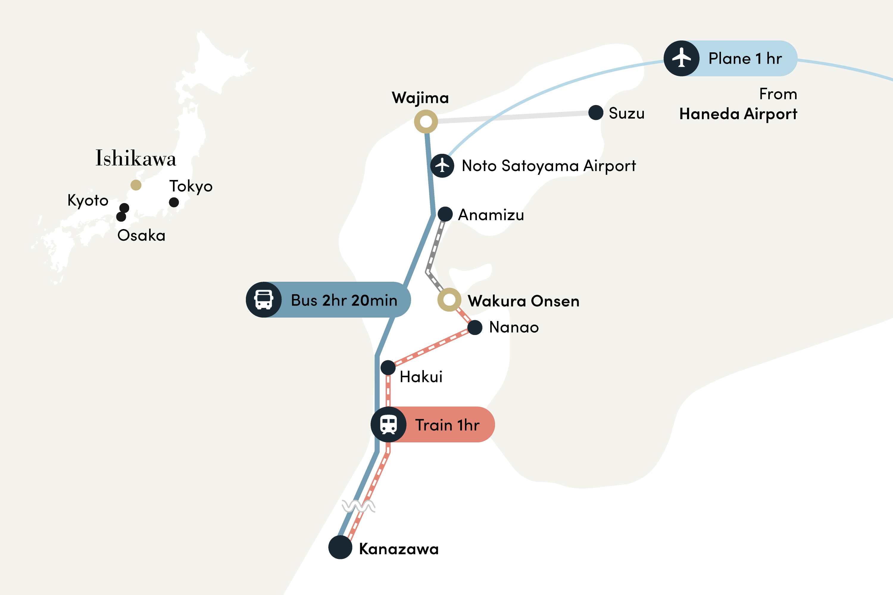 ANA has two daily flights between Tokyo’s Haneda Airport and Noto Satoyama Airport. The trip takes about 1 hour.
