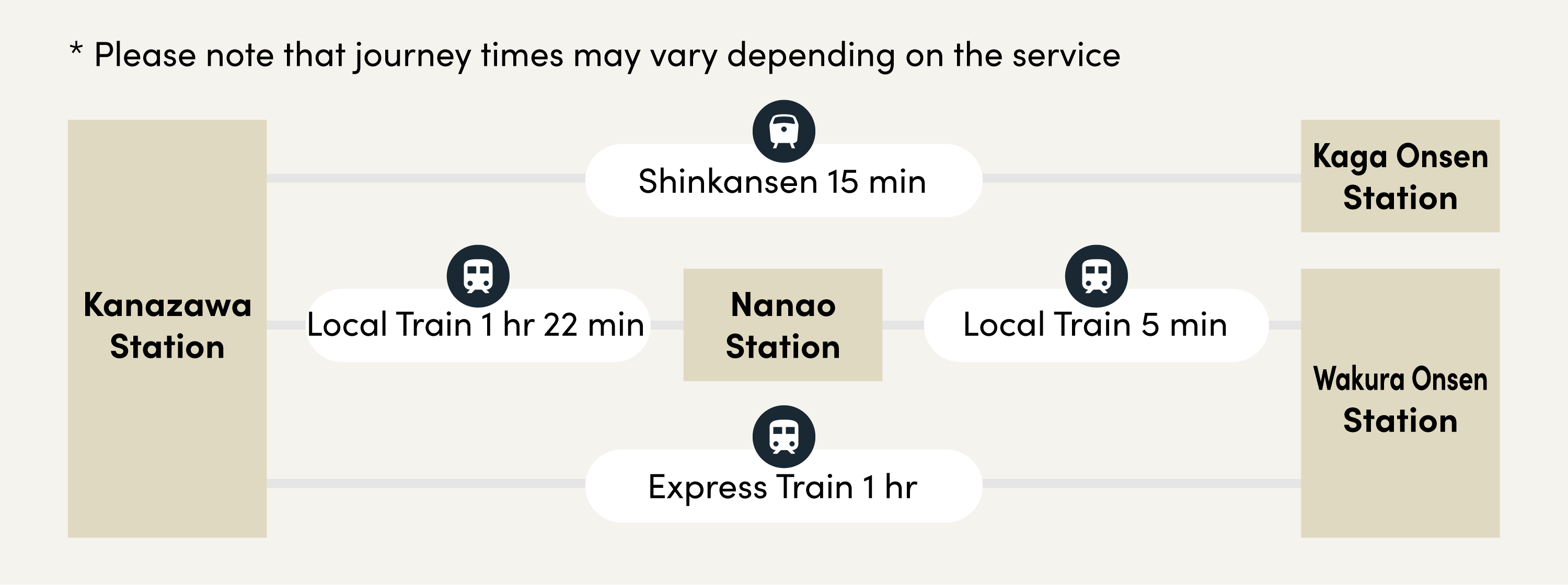 The JR Hokuriku Shinkansen makes it easy to get to Komatsu and Kaga Onsen from Kanazawa. The IR Ishikawa Railway goes east from Kanazawa Station and continues onto the JR Nanao Line toward Nanao and Wakura Onsen. The Hanayome Noren Excursion Train runs on this route. The Nanao Line continues up the peninsula as the Noto Railway to its terminus at Anamizu. This section includes the Noto Satoyama-Satoumi Sightseeing Train.