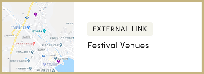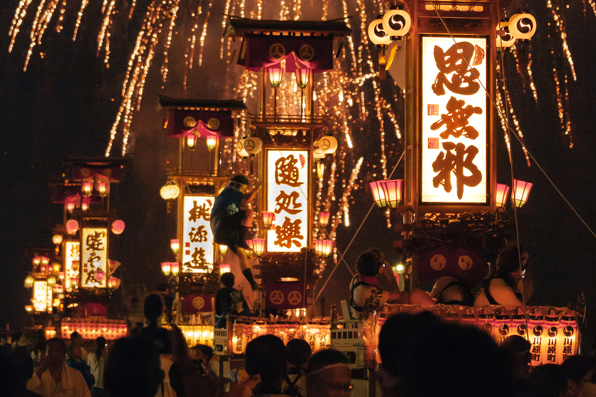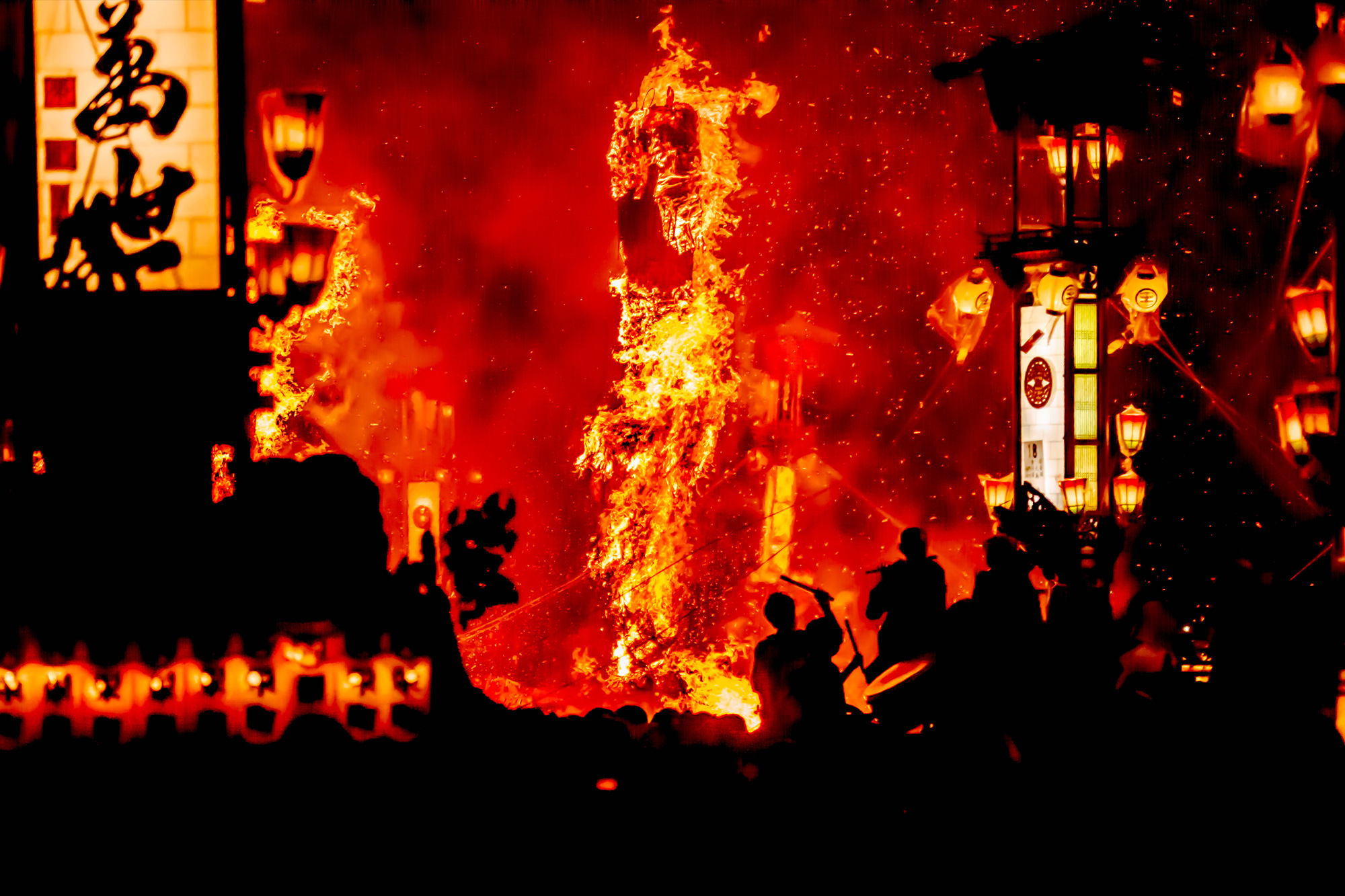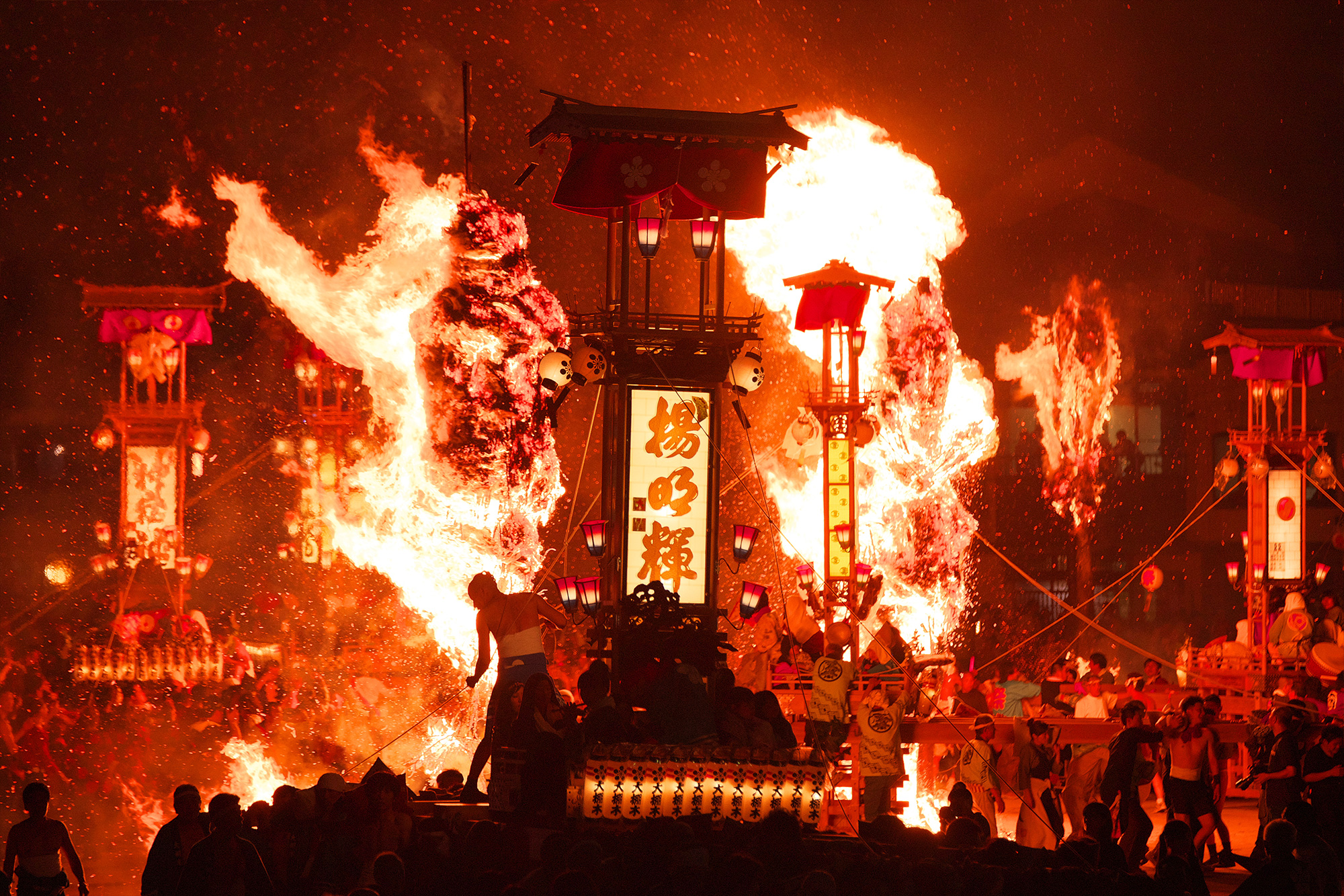 On Friday evening, fireworks signal over 40 kiriko to be carried from Ushitsu Pier to the main city square. Once in the town, they are paraded amidst five flaming pillars and showering sparks. On Saturday night, two mikoshi portable shrines are thrown into the ocean and river before being obliterated and tossed into a bonfire.