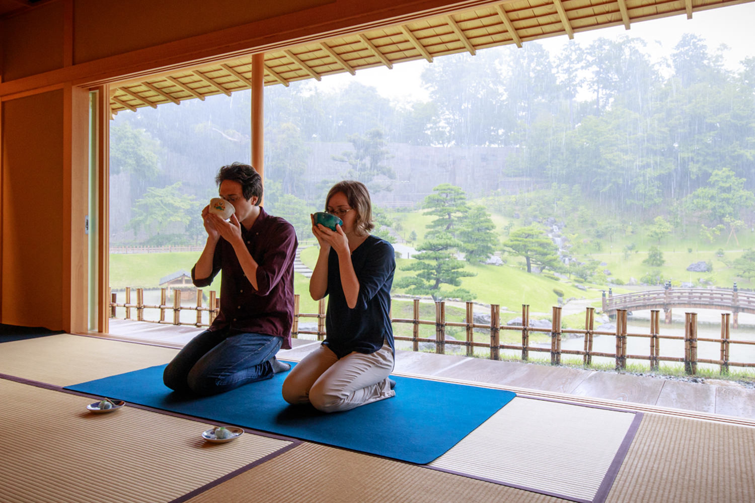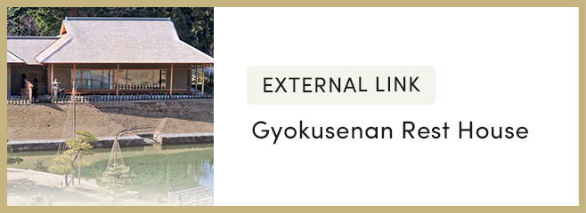 Tea and traditional sweets are available at the Gyokusen-an teahouse, overlooking the garden. Outside the teahouse, there is covered, free seating to leisurely view the garden from an elevated vantage point.
