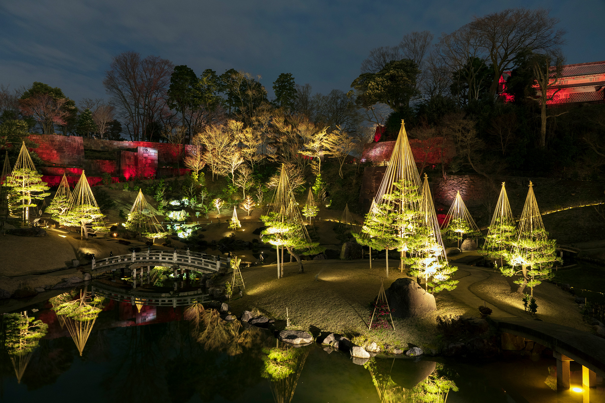 Gyokuseninmaru Garden is a traditional-style garden on the grounds of Kanazawa Castle. Its stepped design creates a sense of verticality. Design features include a stair-like waterfall that flows from one of the garden’s distinctive stone walls. After sunset on Fridays, Saturdays, and days before public holidays, the garden is illuminated with spectacular colors that change with the seasons.