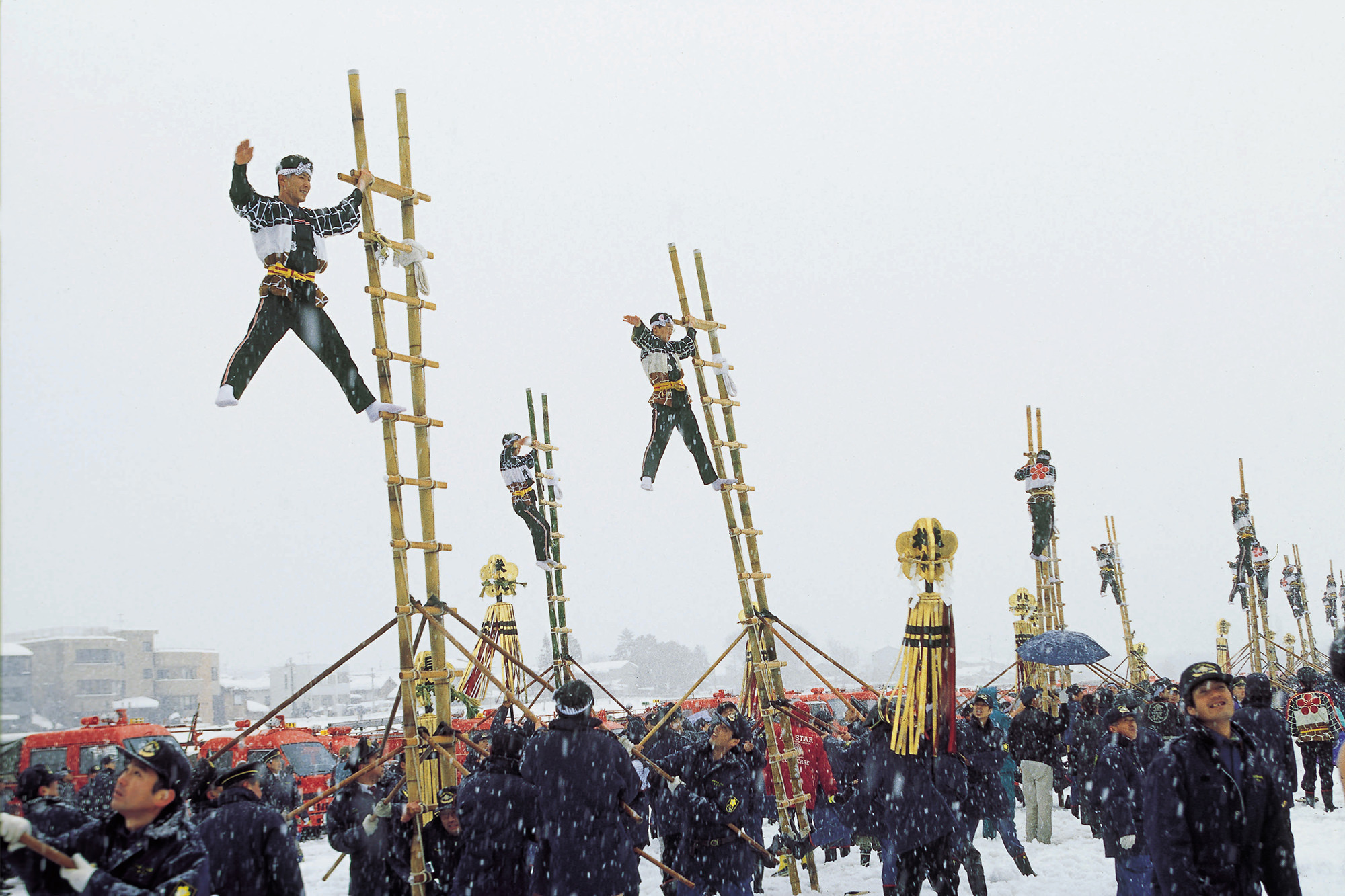 Teams of firefighters display their skills in the main spectacle called the dezomeshiki: acrobatic stunts performed while perched atop tall ladders. Despite the cold Ishikawa winter, the firefighters wear scant, traditional outfits—some are even doused with firehoses while wearing nothing but a loincloth.
