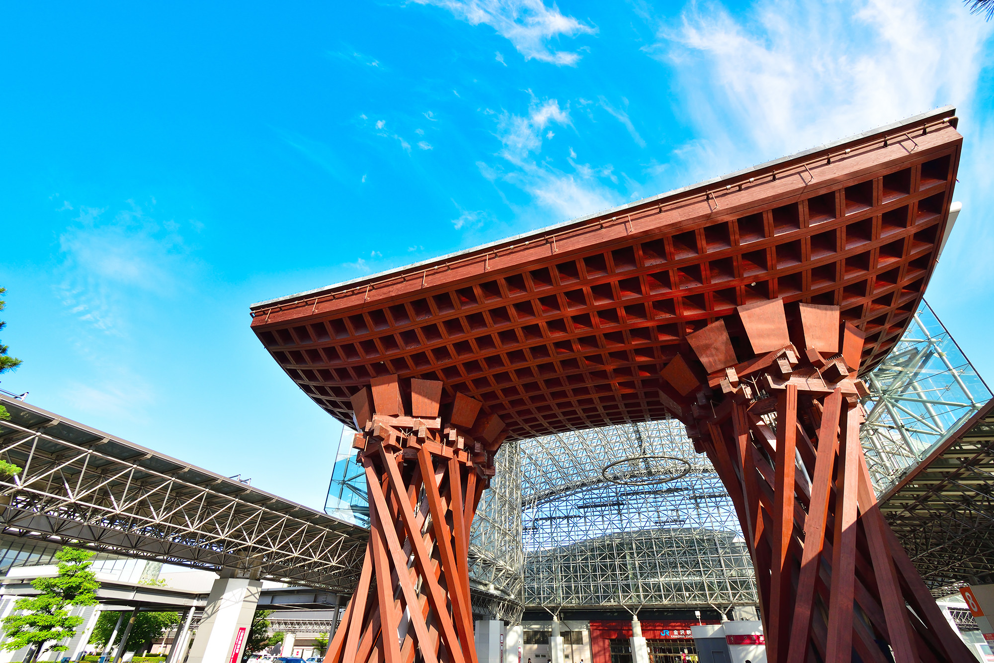 The wooden Tsuzumimon Gate outside the east exit is modeled after traditional Japanese drums called tsuzumi. The gate’s unique style has become a contemporary symbol of Kanazawa. The gate is connected to a large, contemporary-style glass structure called the Motenashi Dome.
