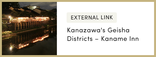 Kazuemachi is one of Kanazawa’s traditional “teahouse” entertainment districts where geiko (the local name for geisha) entertain exclusive clientele with music, dance, and games. This teahouse district was established in the early Meiji era (1868–1912). Kazuemachi’s wooden buildings, cherry trees, and riverside location create a charming atmosphere.