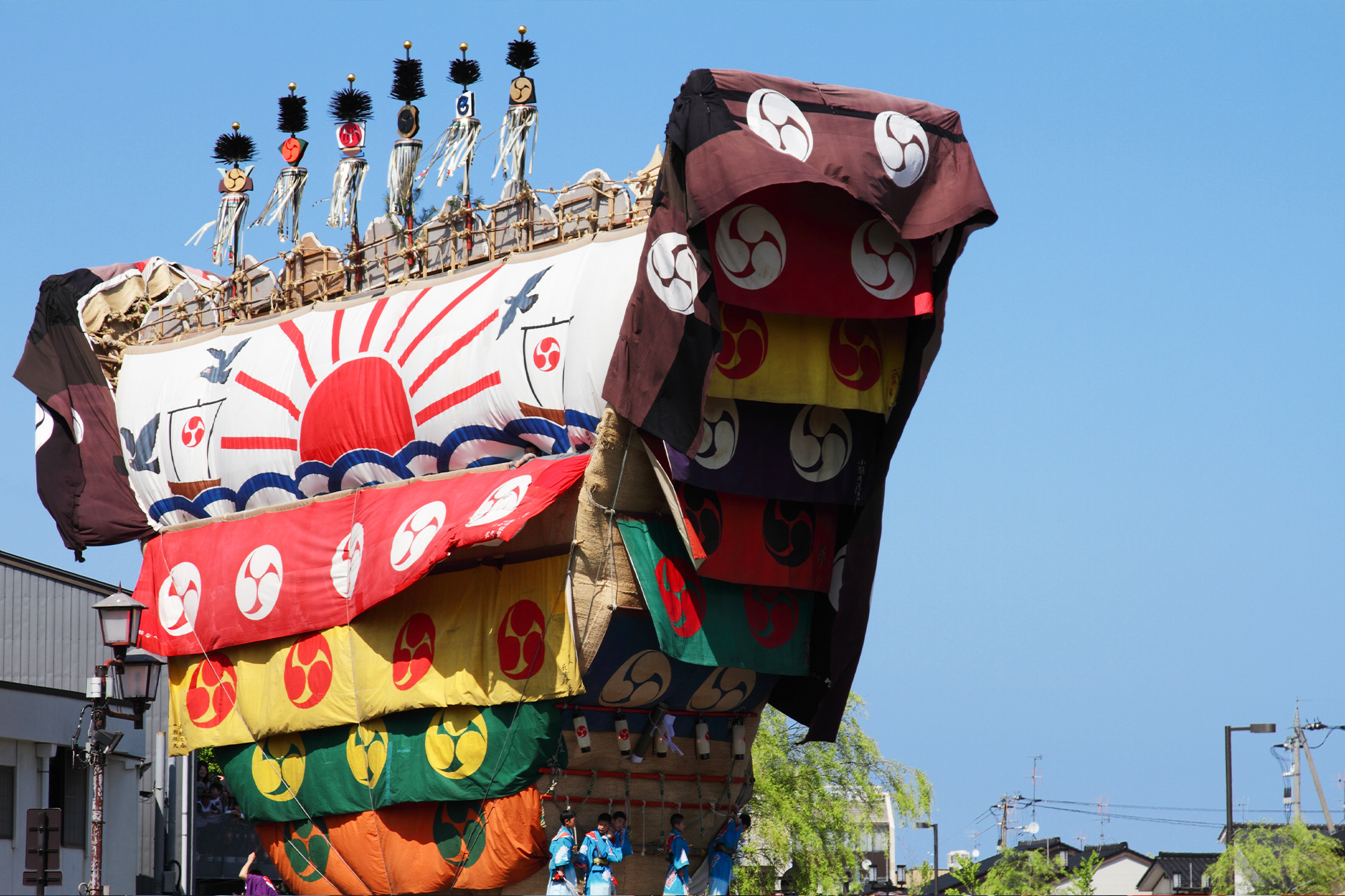 Three districts—Uomachi, Fuchumachi, and Kajimachi—each parade their dekayama around downtown Nanao. The dekayama are handmade anew each year and topped with life-size, handcrafted figures that portray scenes from famous Kabuki plays. Multicolored flags bearing the crest of the district adorn each float.