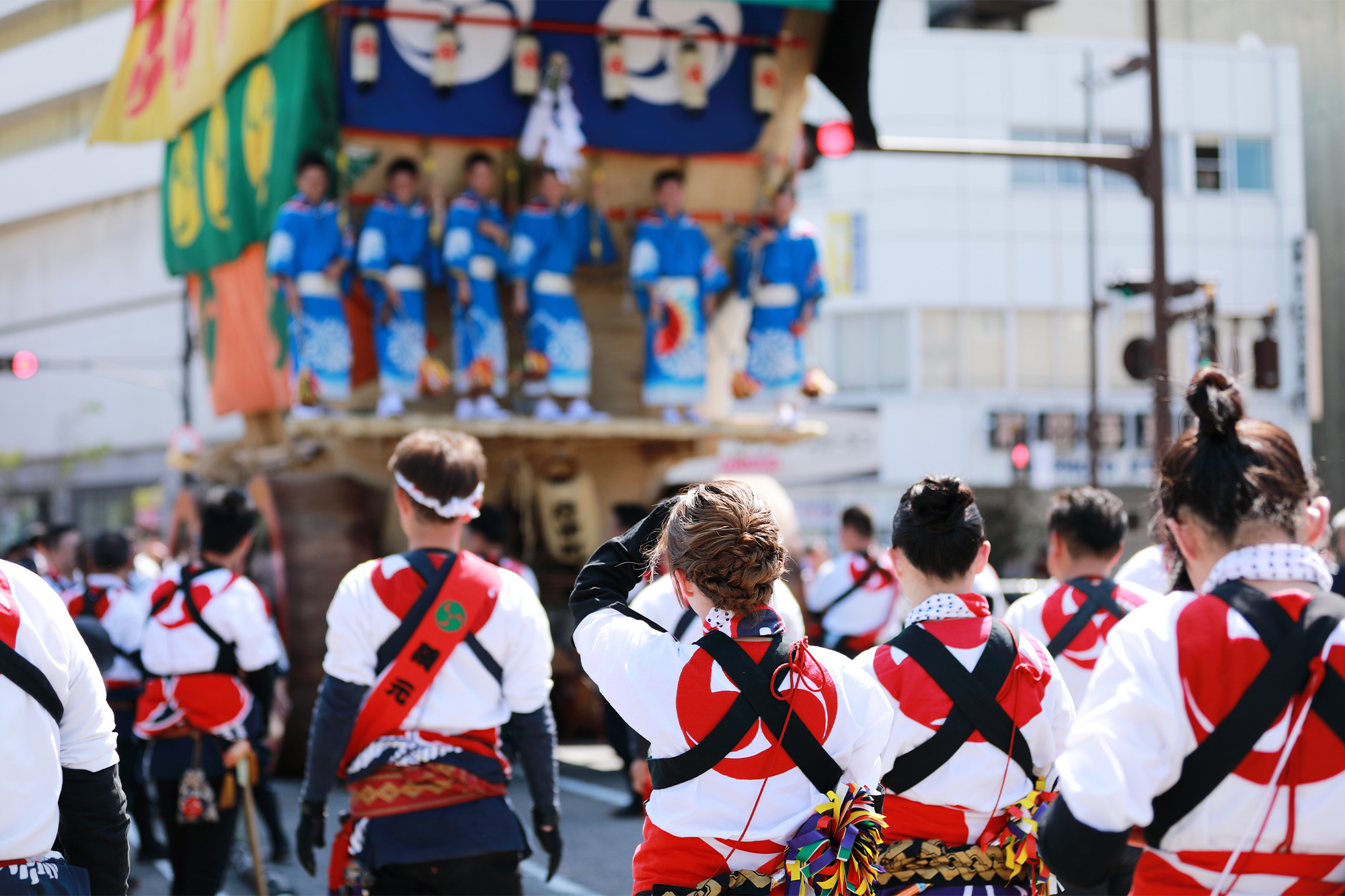 The floats are accompanied by many of the standard trappings of Japanese festivals, such as traditional dances, street food, and game stalls.