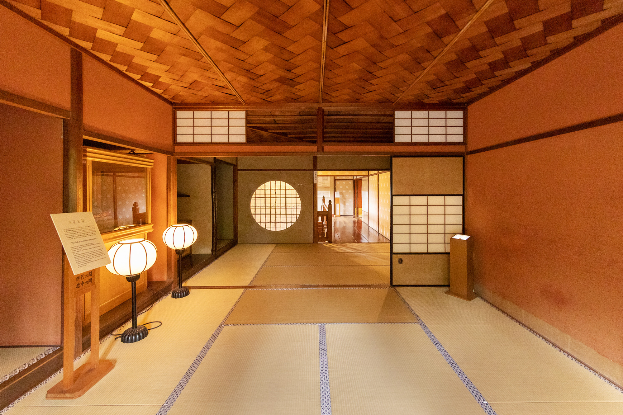 The villa’s architectural style blends traditional Japanese elements with Western touches that were coming into fashion at the end of the Edo period (1603–1867). Examples of period artisanship include colorful openwork carvings, painted screens, American-made chandeliers, and Dutch painted glass. Some sliding shoji panels, traditionally papered, are inset with glass, allowing the residents to view the snow in the garden without letting cold air inside. Walls and ceilings painted in bright colors or decorated with cedar wickerwork adorn the upstairs rooms. Some rooms are named for their painted animal motifs, like the Tortoise Room and the Butterfly Room.