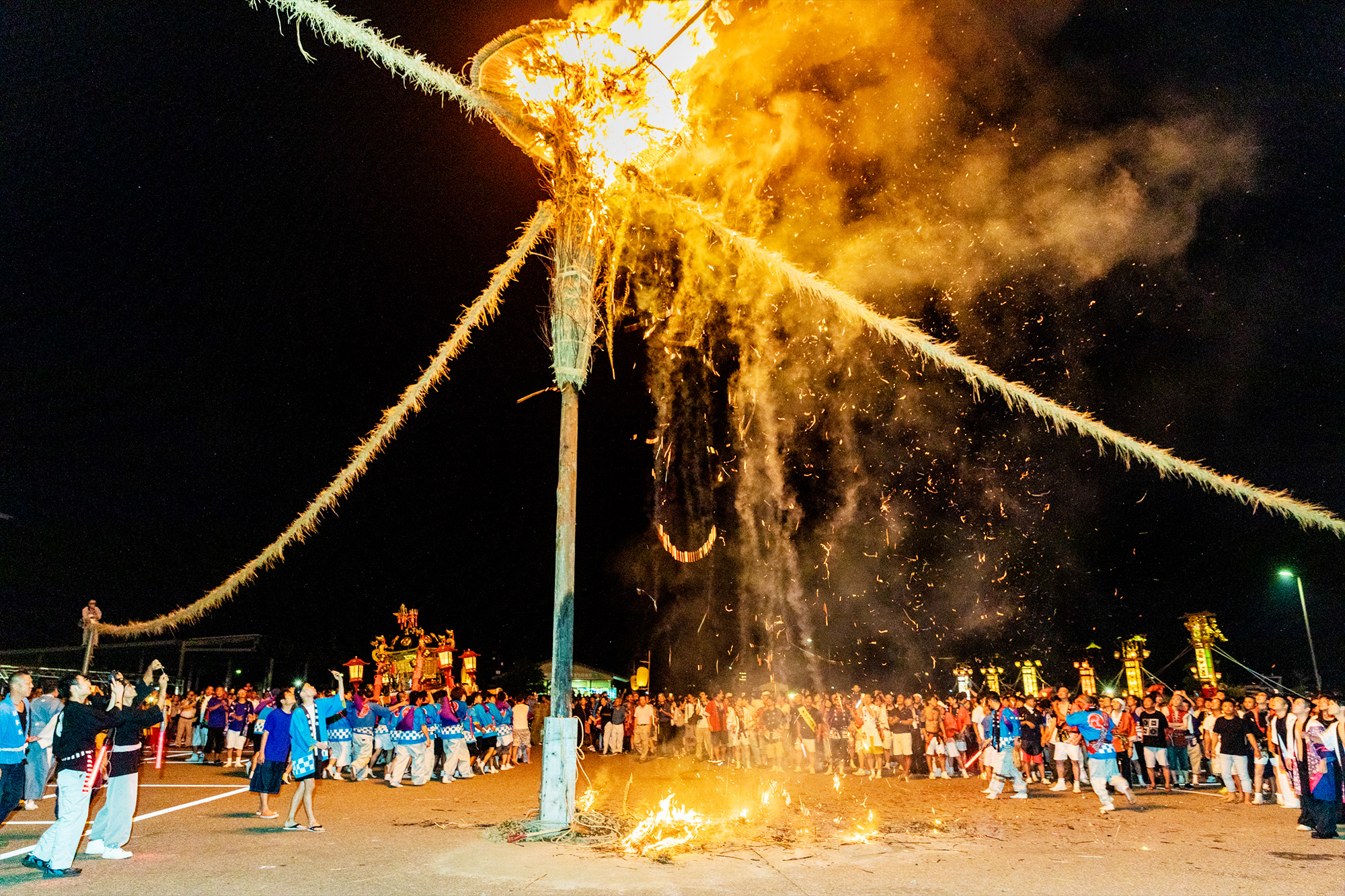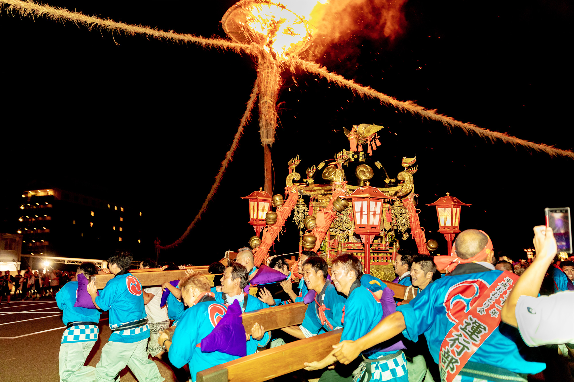 The mikoshi and kiriko processions of the Juzo-jinja Shrine Festival, held on the evening of August 23, lead to a 10-meter-high torch. The torch is set on fire as the mikoshi is raced around it. When the torch burns down, it releases three amulets said to bring good luck, and participants scramble into the fire to catch them.