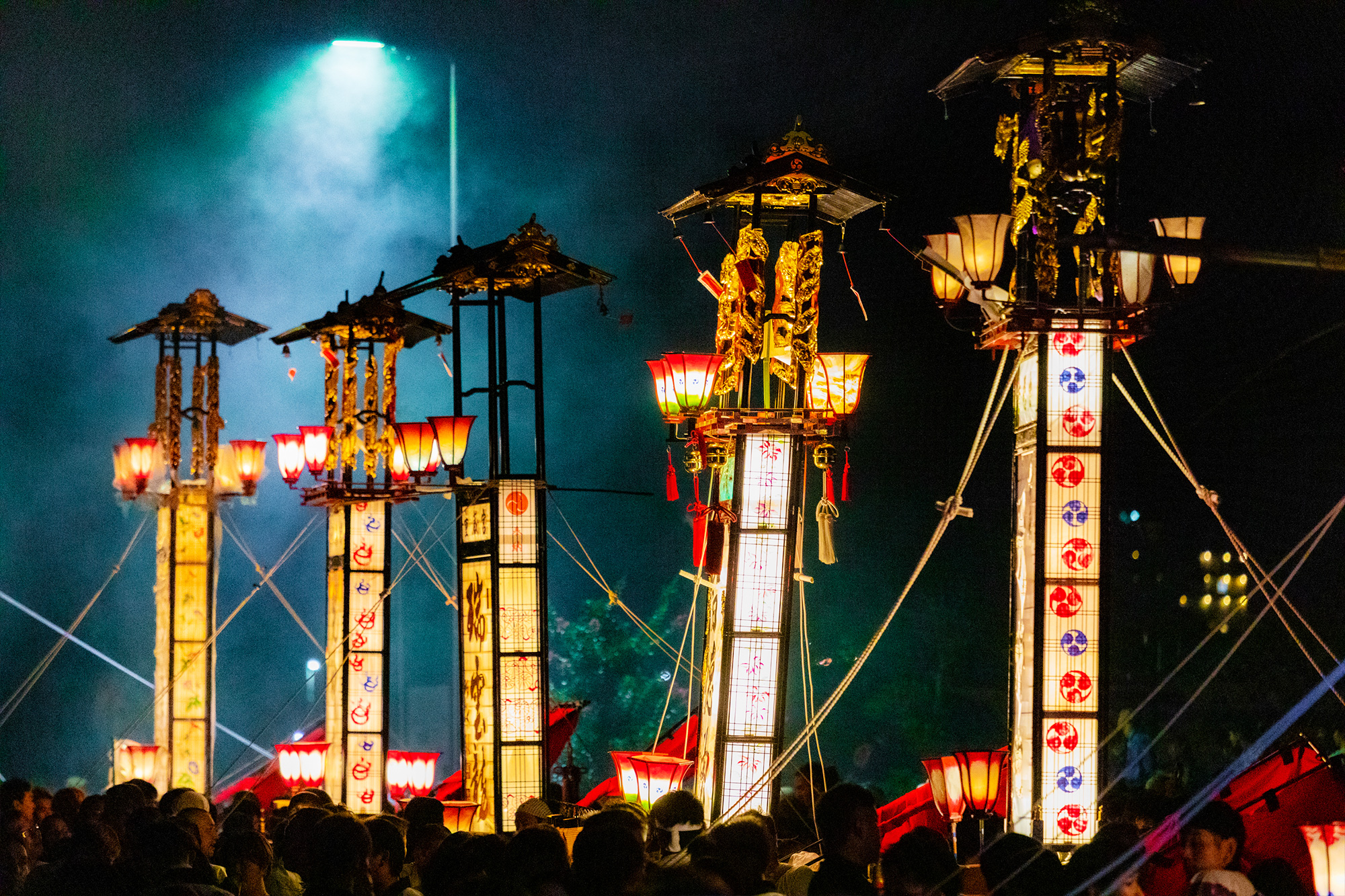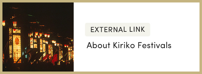 During the Sumiyoshi-jinja Shrine Festival, held on August 24, kiriko are spun violently and sprinted across the Shimbashi Bridge. The procession is accompanied by lively taiko drumming coming from every direction.