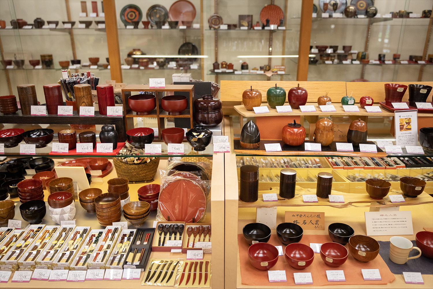 Exhibits show the characteristics and production steps of Yamanaka lacquerware as well as works by famous artisans. The shop sells a variety of lacquerware in a range of sizes and at varying prices. Yamanaka is most famous for its bowls, but other tableware such as dishes and cups is also available.